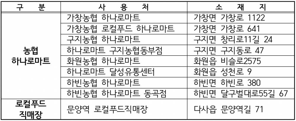 구매 가능한 품목은 국산과일, 흰우유, 계란, 육류, 곡물, 꿀, 두부, 단순가공채소, 산양유로 한정하며, 국내농산물 매장, 온라인 농협의 소비기반 구축 목적에 부합한다. – 쇼핑센터 등