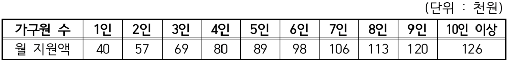 지원금액은 최저생계비 측정결과(한국보건사회연구원)와 생활비를 포함한 식비를 차감한 금액으로 1인 가구 기준 4만원이다. 식비(행복이음계산)를 제공하며, 가구원 수에 따라 차등 지급됩니다.