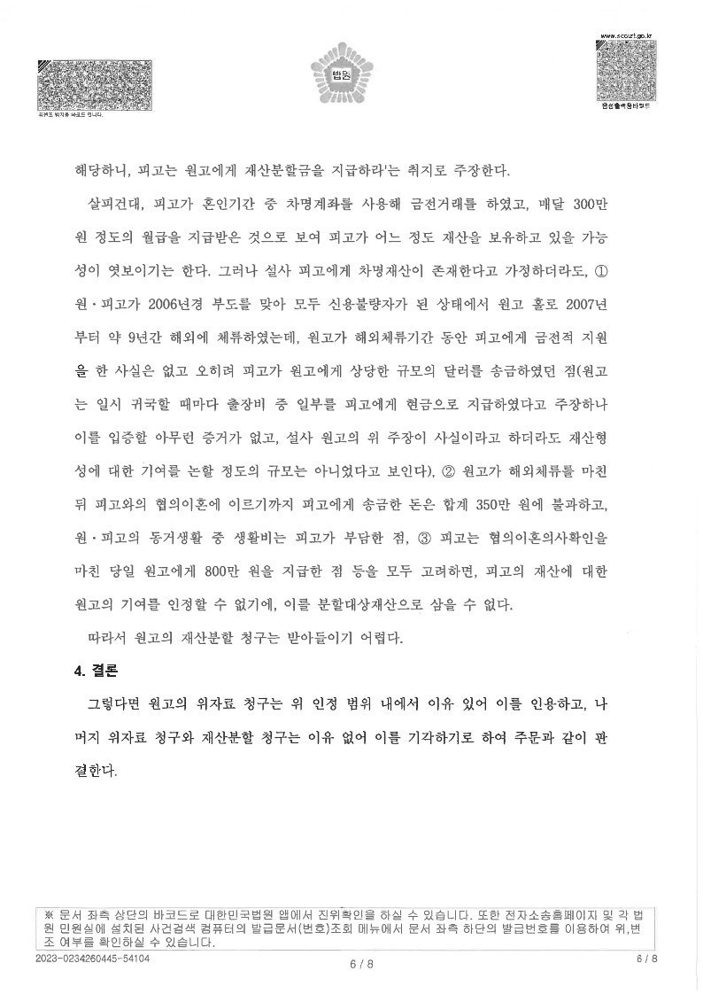가치관도, 집안 배경도, 직업도 다른 두 사람이 애정과 신뢰를 바탕으로 서로를 인생의 동반자로 선택하기 때문에 두 사람의 관계는 끈끈할 것이다. 물론 결혼하고 얼마 지나지 않아 여러 가지 이유로 갈등이 생기겠지만, 서로가 서로를 배려하고 이해한다면 분명 이겨낼 수 있을 것이다. 그 경험을 통해 서로에 대한 신뢰가 더 강해졌고 서로에게 더 의존하게 되었습니다. 그러나 0마을은 자르면 아무것도 남지 않는다는 의미이기도 하다. 실제로 한국에서는 매년 법적 절차를 통해 남남에서 남남으로 수많은 커플이 헤어지고 있다. 신혼부부에서 신혼부부, 황혼기를 보낸 노부부까지, 서로를 흐름에 맡기는 결정이다.
