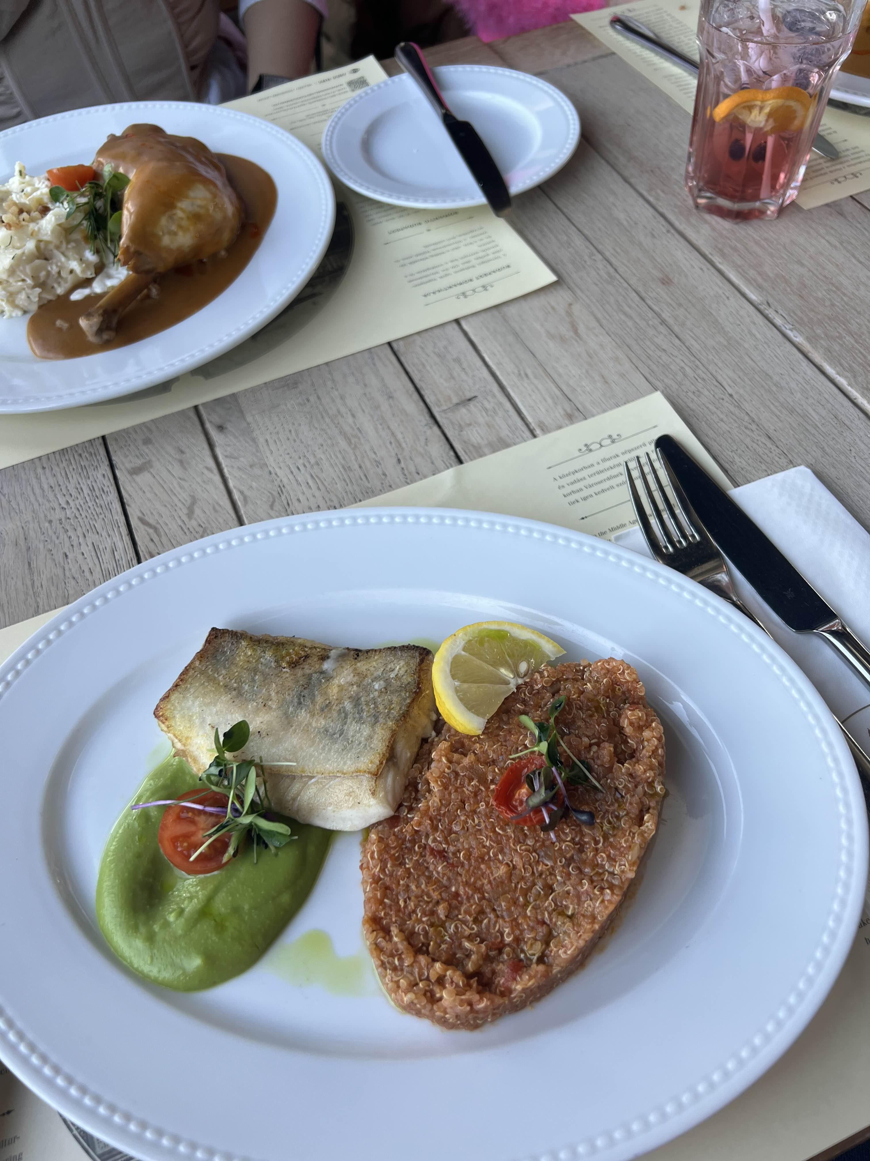 퀴노아를 곁들인 구운 농어에 토마토와 콩 크림 소스를 곁들인 요리.
