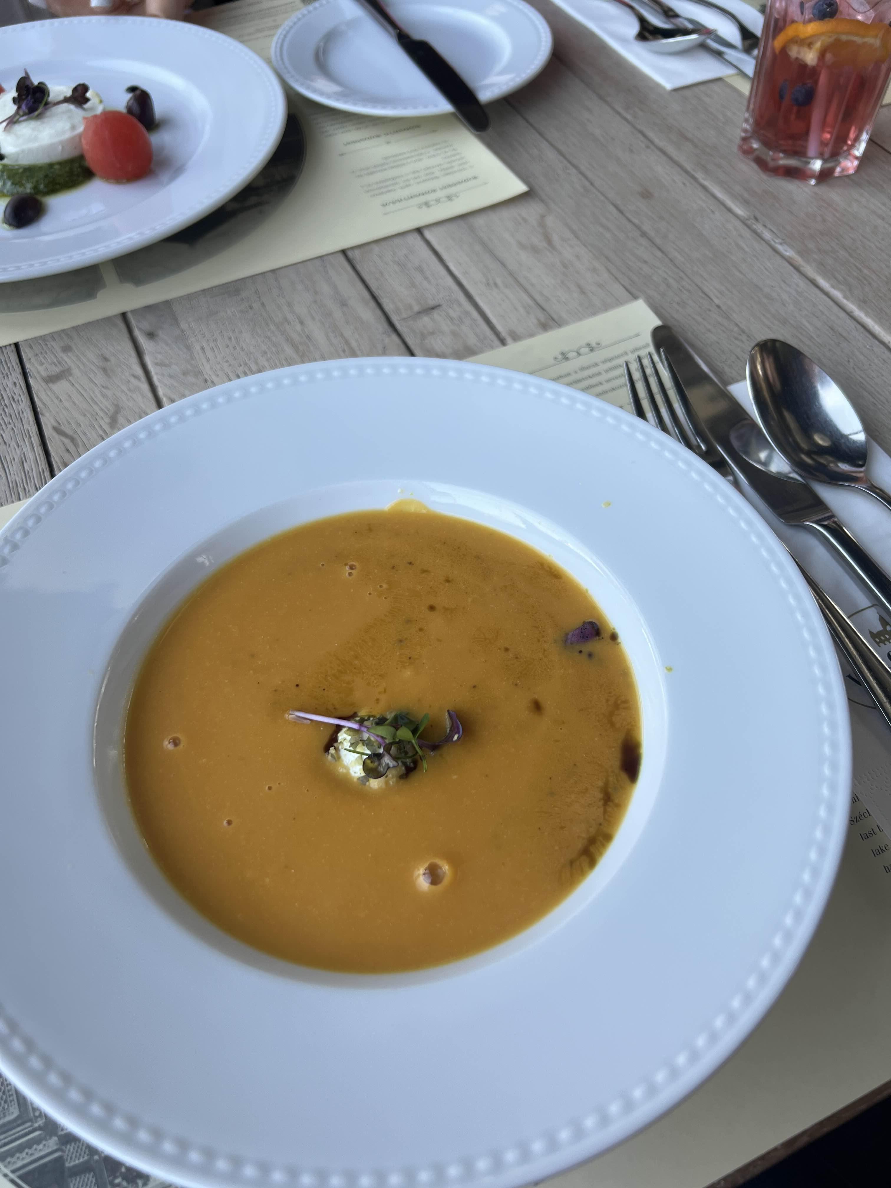 가니쉬만 있는 그릇을 가져다가 크림스프를 바로 앞에 부어줍니다. 너무 맛있었습니다!