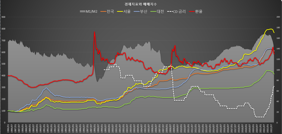환율이 상승하면 유동성이 떨어지고 금리가 하락하며 금리가 하락하면 거래 가격이 상승합니다.