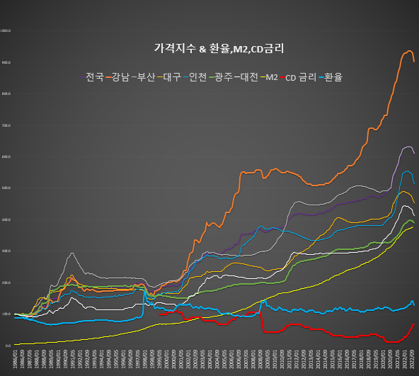 이번에는 무역 지수, m1/m2 비율, 금리 및 환율을 하나의 테이블에 결합했습니다.
