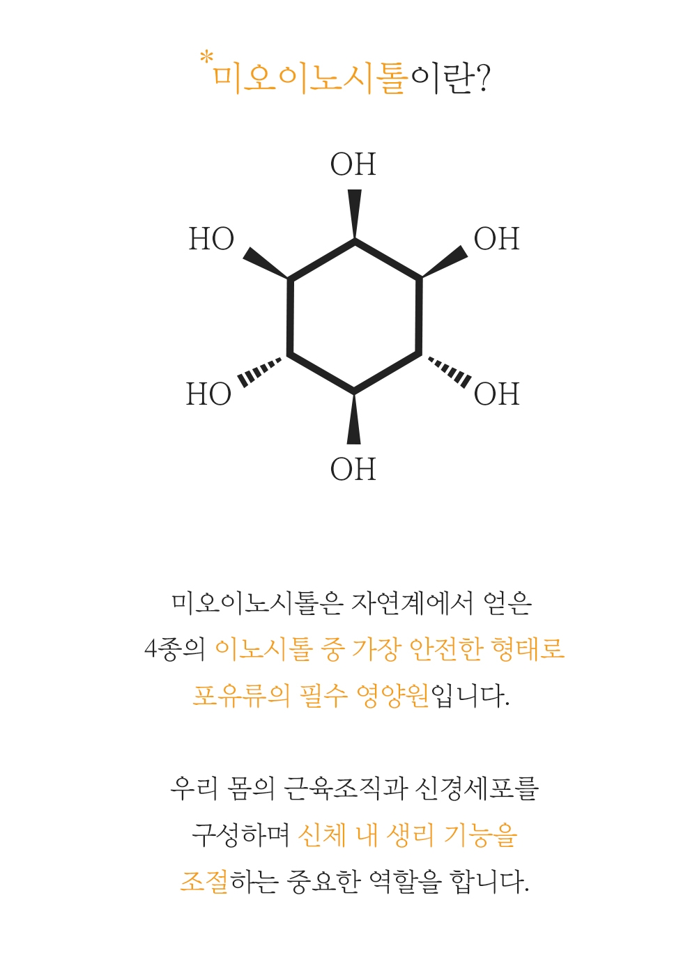 이노시톨은 세포의 구조를 만들고, 호르몬 생산을 돕고, 뇌의 인슐린 및 신경 전달 기능에 영향을 미치며, 세포막의 주요 구성 요소입니다. 또한 이노시톨은 보통 미오입니다. 이노시톨을 가리키는데 DCI-이노시톨도 있다. 특히 미오이노시톨은 여성의 건강에 도움을 주며, 제2형 당뇨병과 다낭성난소증후군에서 인슐린 저항성을 낮추고 불안 해소에 도움을 준다.