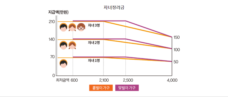 아동 연령 기준: 고용 수당 및 아동 수당을 받으려면 18세 미만이어야 합니다. 18세 미만 1명(상한) 800,002 1.60 3명 ~ 240만 쌍까지 소득기준이 4,000만원 미만이어야 지원 가능 2023년 1월 1일 이후에 신청하십시오.