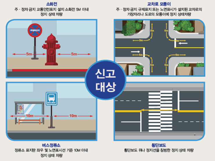 4대의 차량에 대한 절대 주차 및 정차 구역 신고 방법