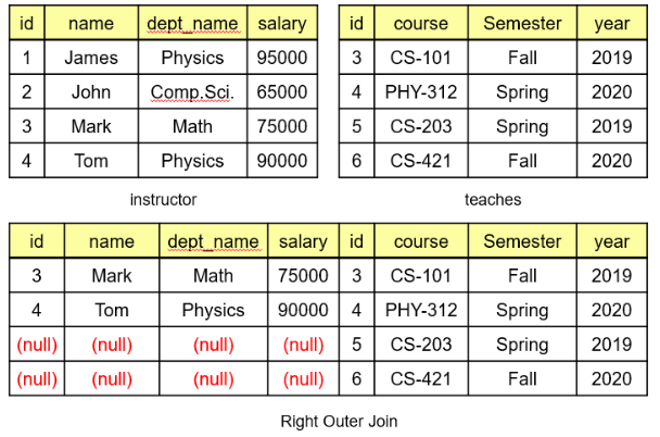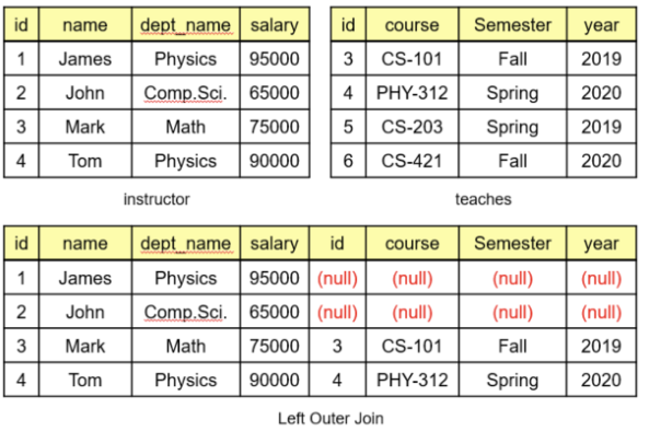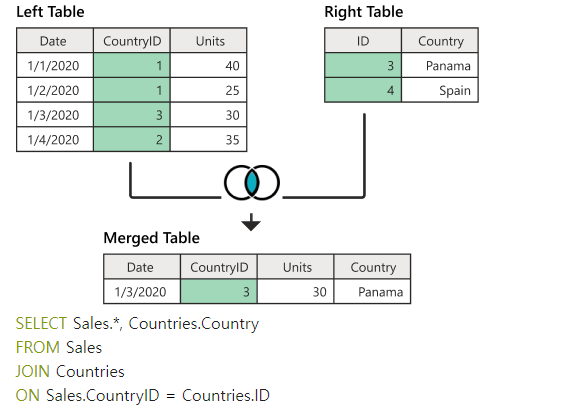 왼쪽 테이블에서 일치하는 행만 결합되고 일치하지 않는 행은 null 값으로 채워집니다.